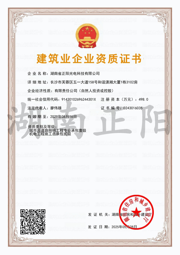 2025年4月8日,經(jīng)長沙市住房和城鄉(xiāng)建設局審核批準,湖南省正陽光電科技有限公司成功獲得“施工勞務”資...